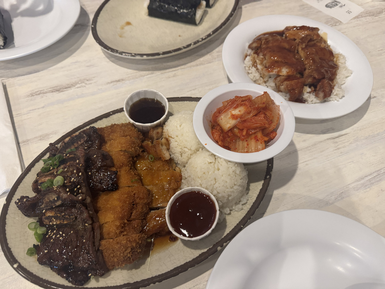 네 명이서 KALBI COMBO와 Chicken teriyaki bowl, 무스비 등등을 시켰다.